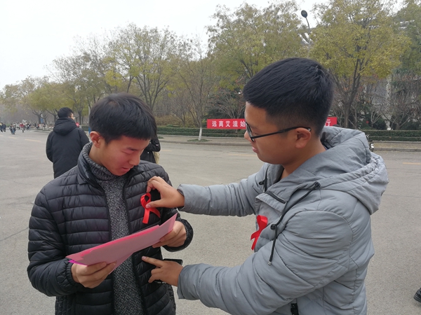 活动现场气氛热烈,“手拉手同牵红丝带心连心共防艾滋病”“远离艾滋始于心体育锻炼践于行”等宣传标语鲜艳醒目;各系根据学科专业特点制作的预防艾滋病知识展板吸引同学们驻足观看;佩戴红丝带的志愿者不惧严寒,为过往同学们发放艾滋病知识宣传单、预防手册和红丝带,奉献自己的一份爱心,并耐心为同学们讲解预防艾滋病的知识。同学们纷纷在“主动检测 知艾防艾共享健康”条幅上签上自己的名字。