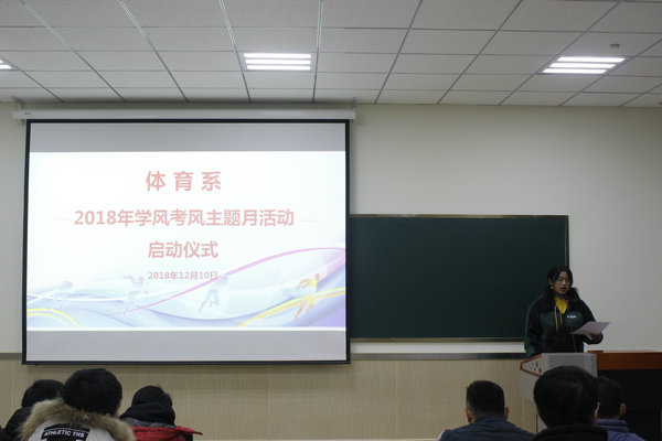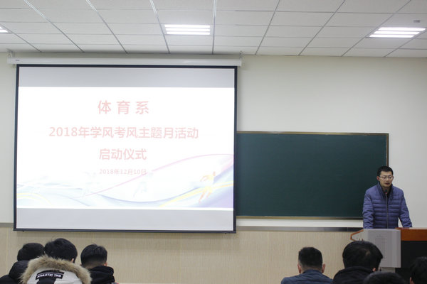 为深入贯彻全国教育大会精神,促进学生的全面发展和健康成长,体育系于12月11日启动“学风考风主题教育月”活动。体育系党总支副书记陈长峰和全系学生代表200余人参加启动仪式,仪式由辅导员马腾主持。