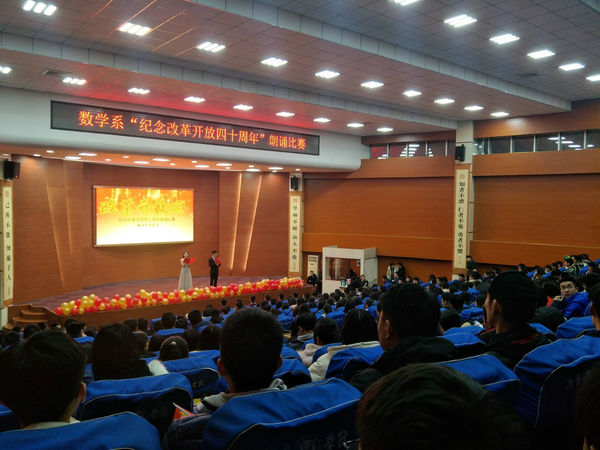 12月18日上午10点,庆祝改革开放40周年大会在人民大会堂举行,习近平总书记发表重要讲话,强调改革开放是我们党的一次伟大觉醒,是中国人民和中华民族发展史上一次伟大革命。全国人民都热烈学习讨论习近平总书记重要讲话精神。恰好在这样的一个日子,数学系党总支18日晚在理科楼报告厅举办了“庆祝改革开放40周年”诗歌朗诵比赛。比赛特邀中文系老师孟冬梅、孟琳、郑飞作为此次比赛的评委。系党总支书记来维龙、副书记黄长虹,团总支副书记冯秉政以及系辅导员老师出席比赛。