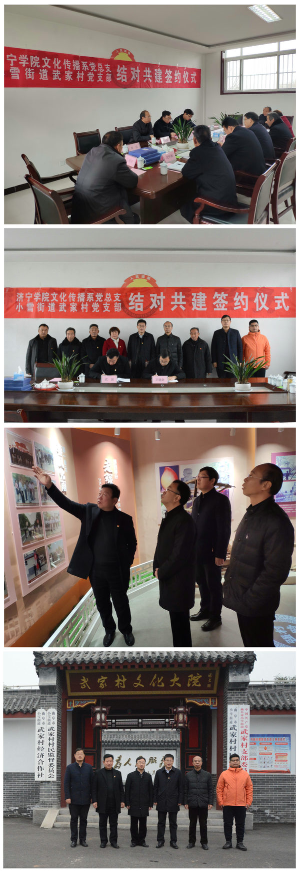 12月21日,文化传播系党总支与曲阜市小雪街道武家村党支部“结对共建”签约仪式在武家村举行。小雪街道党工委书记宫同文、武家村党支部书记武波、文化传播系党总支书记卫建勋、教工党支部书记祝令建、学生党支部书记孔瑞、组织员黄超和武家村党支部全体成员共同参加活动。