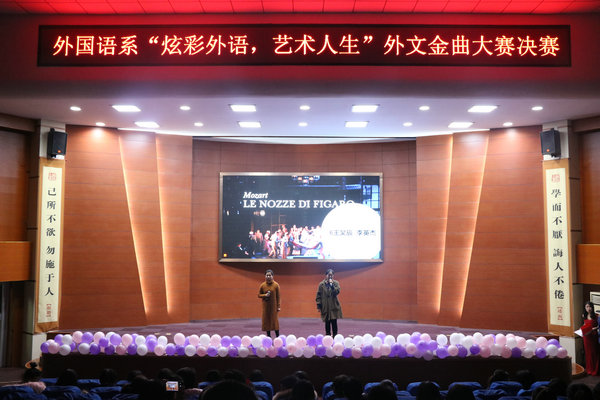 经过初赛、复赛的两轮淘汰选拔,最终有12名选手进入到决赛。本次比赛共分为两轮:自选曲目独唱、指定曲目合唱。选手们通过独唱、合唱演奏了一首首经典的英语、日语以及意大利语歌曲。他们用饱满的热情、醇美的嗓音为观众们奉上了一场充满异国情调的听觉盛宴。最终经过激烈的角逐,来自数学系的杨旭荣获一等奖,外国语系王迪、音乐系李英杰获得二等奖,中文系李宇等同学获得三等奖。
