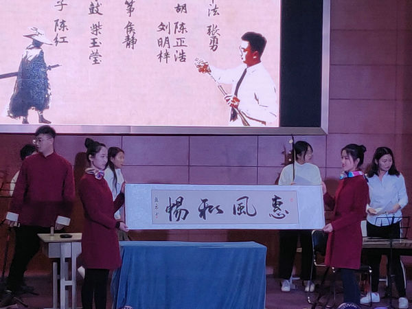 晚会在系主任王绍峰和全体辅导员的祝福视频中开篇,街舞《BangBangBang》、“团队之星”啦啦队的啦啦操以及舞蹈串烧彰显了当代大学生的青春活力;歌曲《房间》和《背对背拥抱》让学生感受到音乐对心灵的慰藉,朗诵《致橡树》让我学生体会到纯真爱情的甜美;相声《满腹经纶》、《三大才子》及小品《幕中无人》幽默风趣的语言逗得现场观众笑声不断;书法表演则展现了中华汉字的意境之美,花式悠悠球通过酷炫的动作、精妙的搭线展现了指间的精彩。晚会期间系副主任黄长虹为系2018年度十佳歌手进行颁奖,获奖选手还进行了歌曲串烧,将晚会的气氛推向高潮。最后系主任王绍峰上台致词,他首先回顾2018年数学系在党建、学科专业、体育活动等方面取得的优异成绩,展望2019年要迎接本科教学工作审核评估,希望数学系能够展现自己的风采,作为有着悠久历史和优良传承的院系,全系上下要不忘初心、砥砺前行。