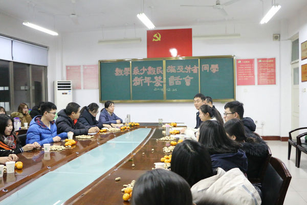 为更好地关心少数民族及外省同学的学习与生活,增强同学们民族团结意识、促进同学们和谐相处,数学系12月26日晚六点半在系会议室,召开少数民族及外省同学新年茶话会。系党总支书记来维龙、副主任黄长虹、团总支副书记冯秉政和各级辅导员,以及少数民族和外省同学参加茶话会。茶话会由冯秉政主持。
