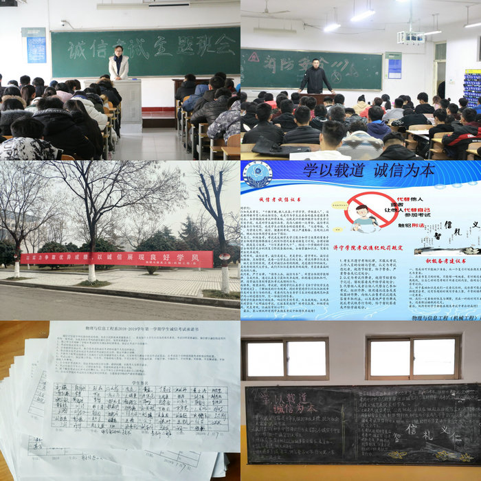 物理与信息工程(机械工程)系各班召开诚信考试主题班会,组织学生学习《学生手册》中有关考试纪律的规定和处理办法,全体同学签订了“诚信考试承诺书”,使“诚信守纪光荣,违纪作弊可耻”的观念深入人心,教育学生以正确的态度对待考试,在考试过程中培养诚信守纪的品德和作风。利用黑板报、宣传栏、微信新媒体大力宣传“学以载道、诚信为本”的中华民族优秀传统文化,努力营造诚信迎考的良好考试氛围。
