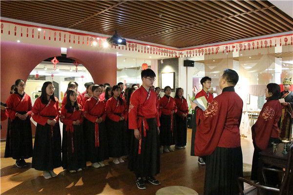 “传礼继世”体验区内,学生们在讲解员的引导下,举行了隆重的拜师礼。老师入席,向先师上香,接拜师贴,面向大成至圣先师孔子行深揖,面向学子奏告。学子献束脩之礼,行深揖之礼,献戒尺接受教诲,以表尊师重道。