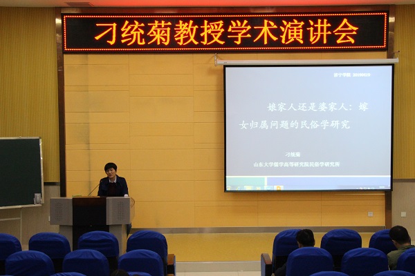 4月19日下午,山东大学儒学高等研究院(文史哲研究院)民俗所教授、《民俗研究》杂志副主编、中国民俗学会常务理事刁统菊博士做客中文系“博雅讲坛”(第15期)暨中文系“学术活动月”系列演讲会(第3场),为近二百名师生作了题为《娘家人还是婆家人:嫁女归属问题的民俗学研究》的精彩演讲。中文系主任王永超博士主持演讲会。