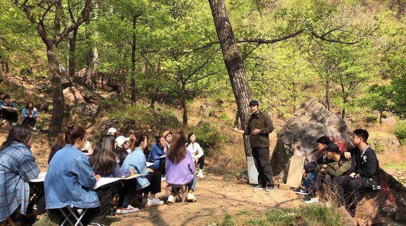 在林州写生教育基地,系主任、党总支副书记褚滨带领总支委员利用课堂教学的主渠道,将思想政治教育与专业教学相结合,将当地优秀传统文化、红色文化、爱国主义教育镶嵌到课堂教学中,让党建工作落到教学实际中,提高教学的针对性和实效性。