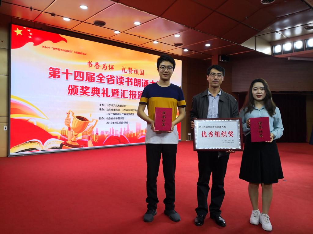 4月23日,“书香为伴 礼赞祖国——第十四届全省读书朗诵大赛”在山东省图书馆举办。本次大赛由山东省文化和旅游厅主办,山东省图书馆、山东省图书馆学会承办,来自全省17个地市的53组选手参加了成人业余组的比赛,我校选手潘亚欣、张日新代表济宁市三组选手之一参加比赛并获得三等奖。