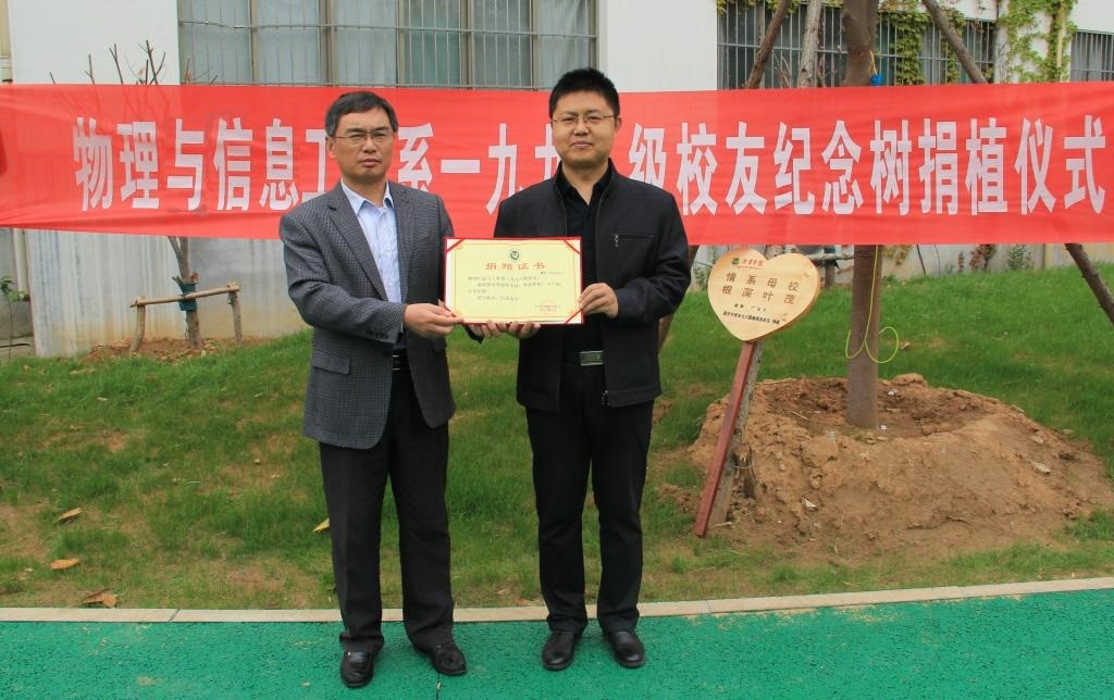 捐植仪式上,物理与信息工程系九八级全体校友捐植认养了三株广玉兰树,以此表达对母校感恩之情。物理与信息工程系党总支书记孙文向校友颁发了捐赠证书。后勤处负责同志和校友代表共同栽置了捐赠纪念牌。