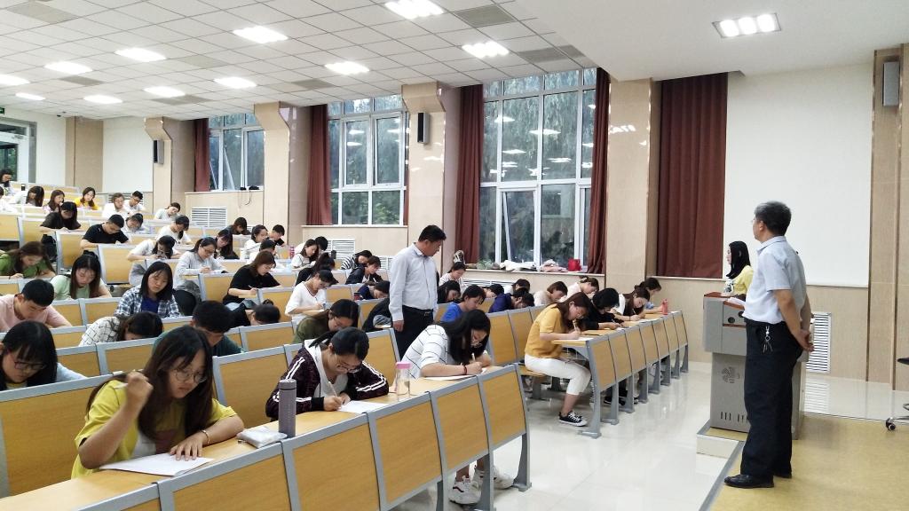 考场分设在文科楼B201、B202两个教室。考试采取闭卷形式,考试内容紧扣习近平新时代中国特色社会主义思想、党的十九大精神、两学一做学习教育、《中国共产党章程》等相关内容。考试现场秩序井然,安静严肃,纪律良好。