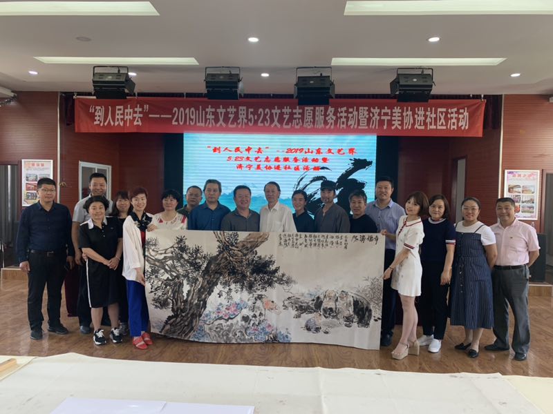 5月23日是第六个全国文艺志愿服务日,美术系党总支书记杨晓青、主任褚滨、副主任张继华、教师李娜随济宁市美协走进任城区济阳街道京杭社区,开展“到人民中去”——2019山东文艺界5.23文艺志愿服务暨济宁美协进社区活动。