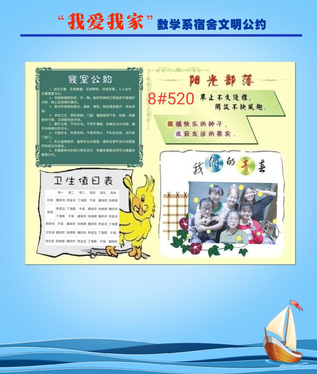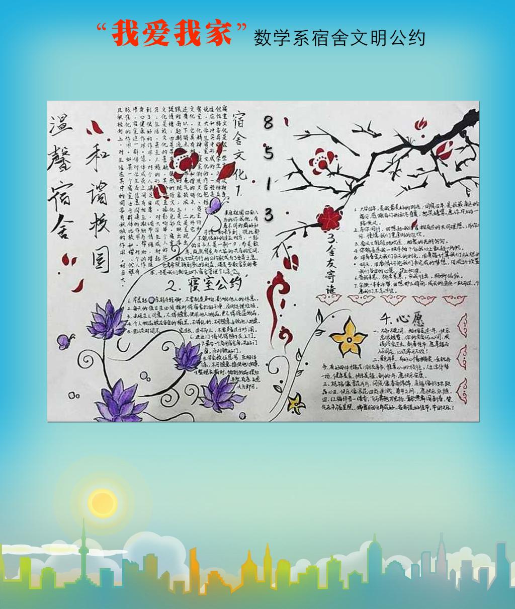 5月22日,数学系第一届“我爱我家”宿舍公约设计大赛圆满落下帷幕。本次活动历时一个月,全面覆盖数学系所有非毕业班宿舍,取得了良好的教育效果。