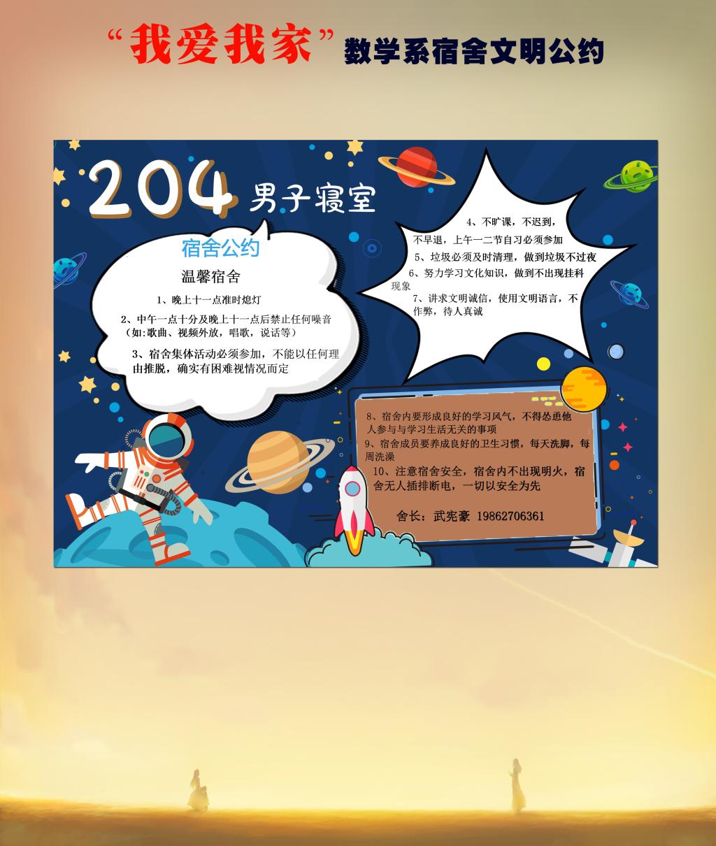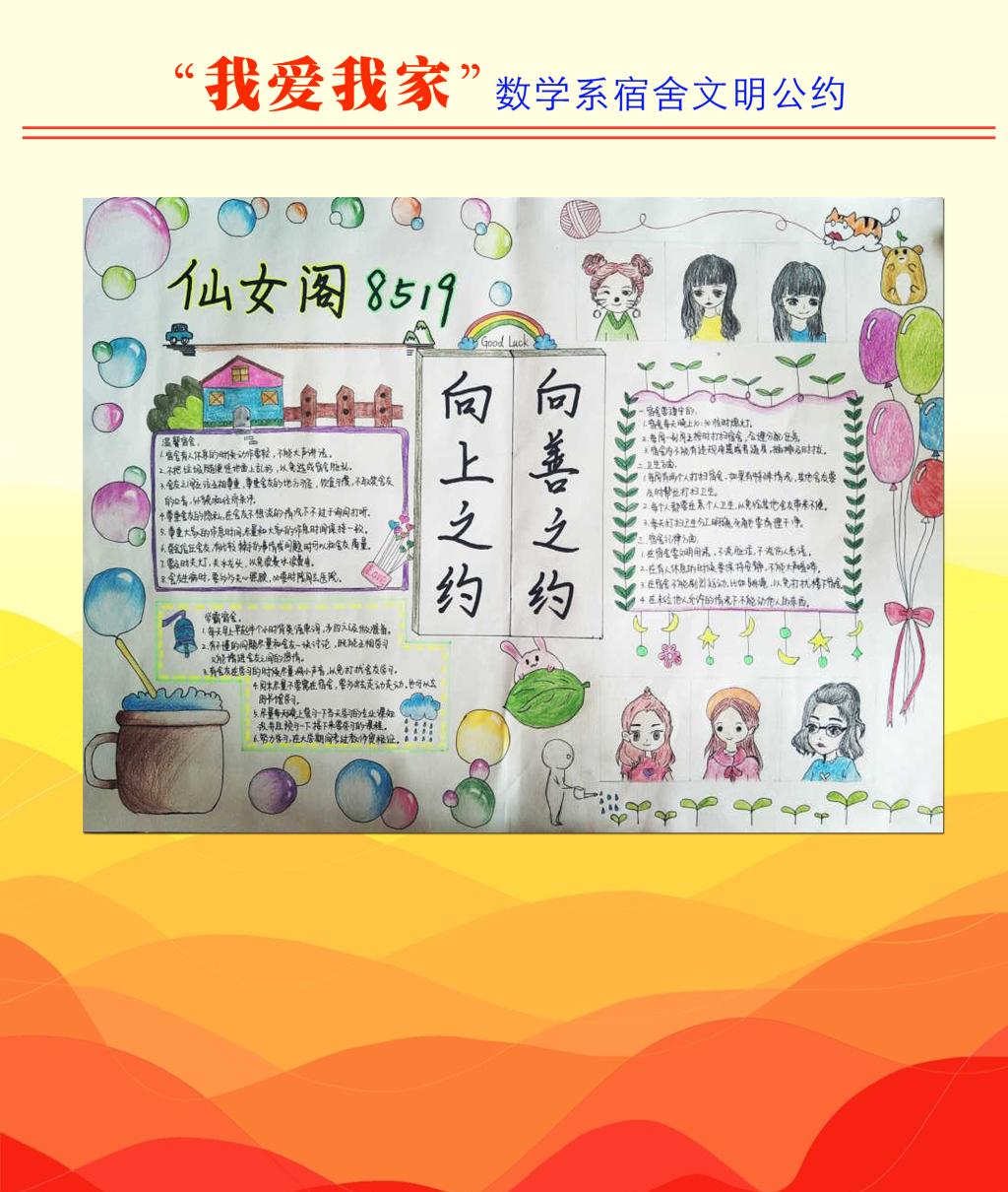 本次活动是数学系宿舍文化建设工作室年度系列活动之一,分为公约制定和海报设计两个阶段。在第一阶段的公约制定环节,每个宿舍根据宿舍实际情况,共同商讨、不断完善,制定出属于自己宿舍的向上向善之约。彰显特色的向上之约和完善自我的向善之约,体现出宿舍成员共建和谐宿舍的美好心愿和坚定信心。在第二阶段的海报设计环节,各宿舍成员齐心协力,一笔笔将公约描绘成美好的画卷,郑重地在公约海报上签下自己名字,并张贴在宿舍醒目位置,提醒大家时刻遵守共同的约定。