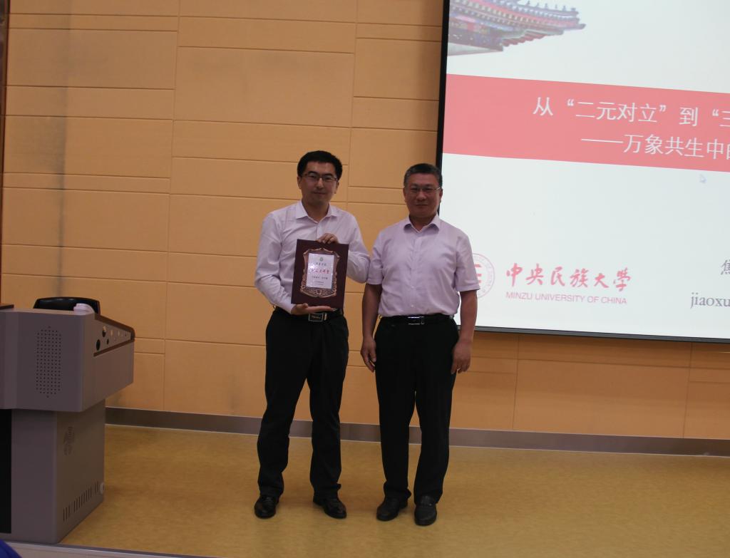 2019年5月28日,外国语系校友、中央民族大学民俗学博士焦学振走进“校友大讲堂”。外国语系党总支书记陈彦华为其颁赠“校友大讲堂”纪念铭牌。外国语系师生代表和校友会办公室有关人员200余人参加报告会。