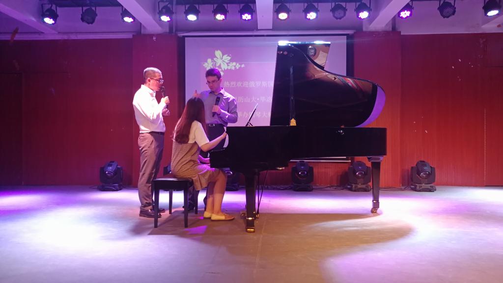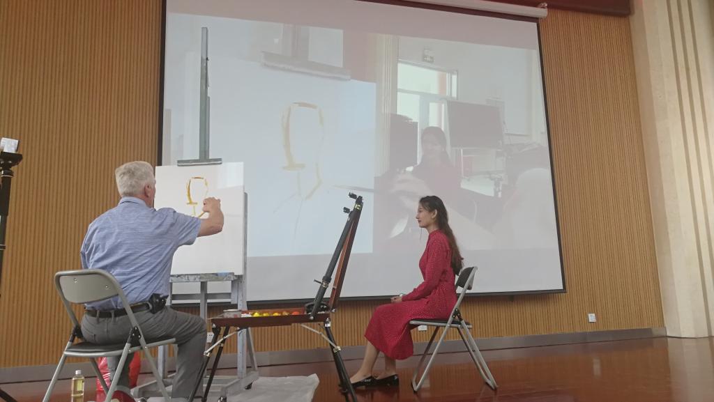 安德烈教授通过展示个人及其学生的作品与美术系师生分享了他的创作理念和思路,并且进行了现场作画。亚历山大教授在音乐系排练厅与登台的学生进行了一对一的指导、交流,对学生弹奏的曲目进行现场点评并进行示范弹奏。