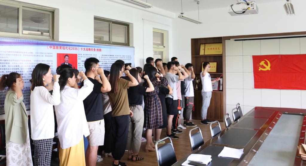 最后,所有党员面对鲜红的党旗,庄严地重温入党誓词,铿锵的誓词表达了同学们不忘初心、牢记使命,忠诚为党,不懈奋斗的坚定誓言,表达了同学们在新的学习和工作岗位上努力学习,积极工作,再创辉煌的坚定决心。
